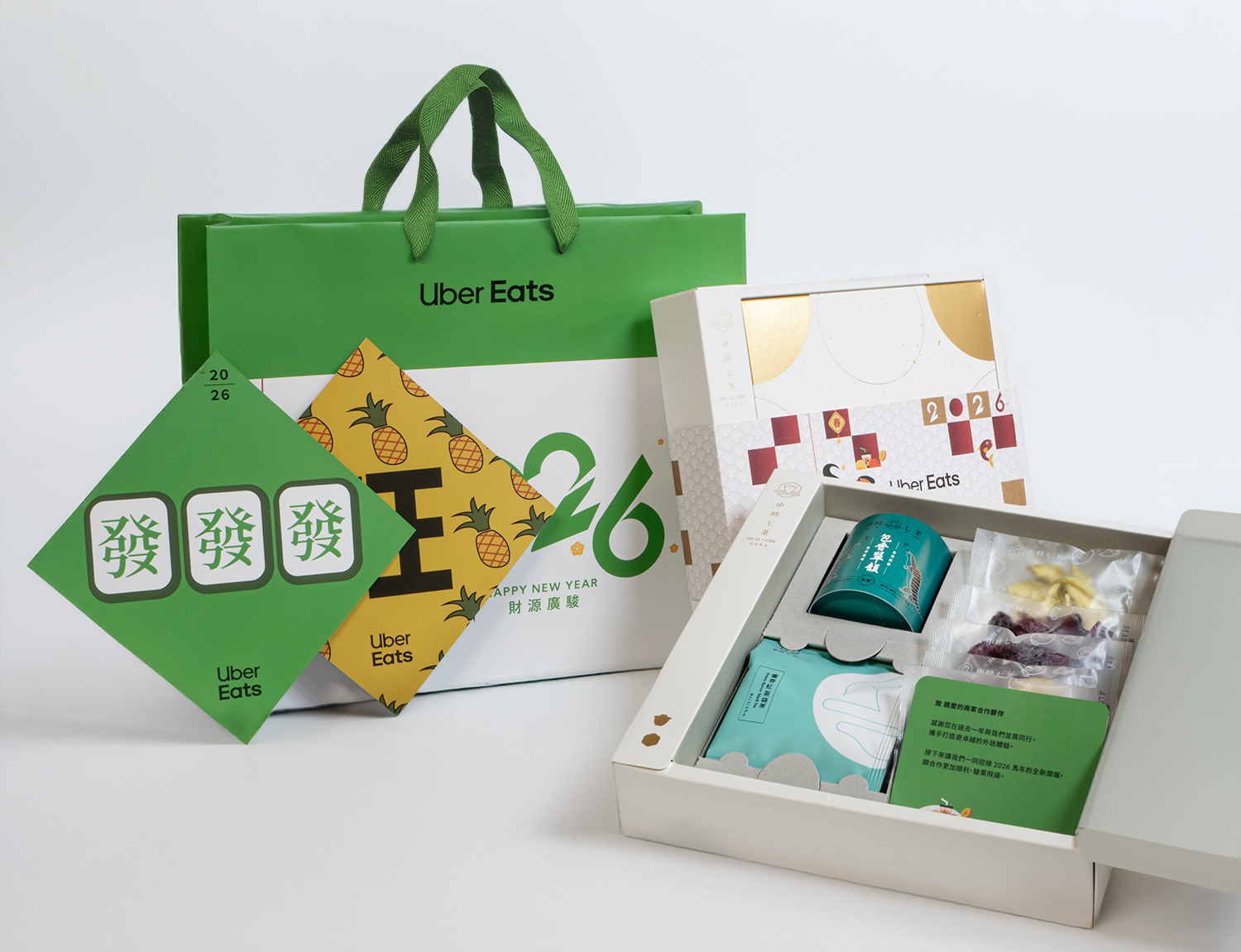 以「分享喜悅」為設計靈感,延續 Uber Eats 連結人與美食的品牌精神。禮盒結合精選茶食與新春元素,讓節慶的祝福在日常生活與商家場域中自然流動。